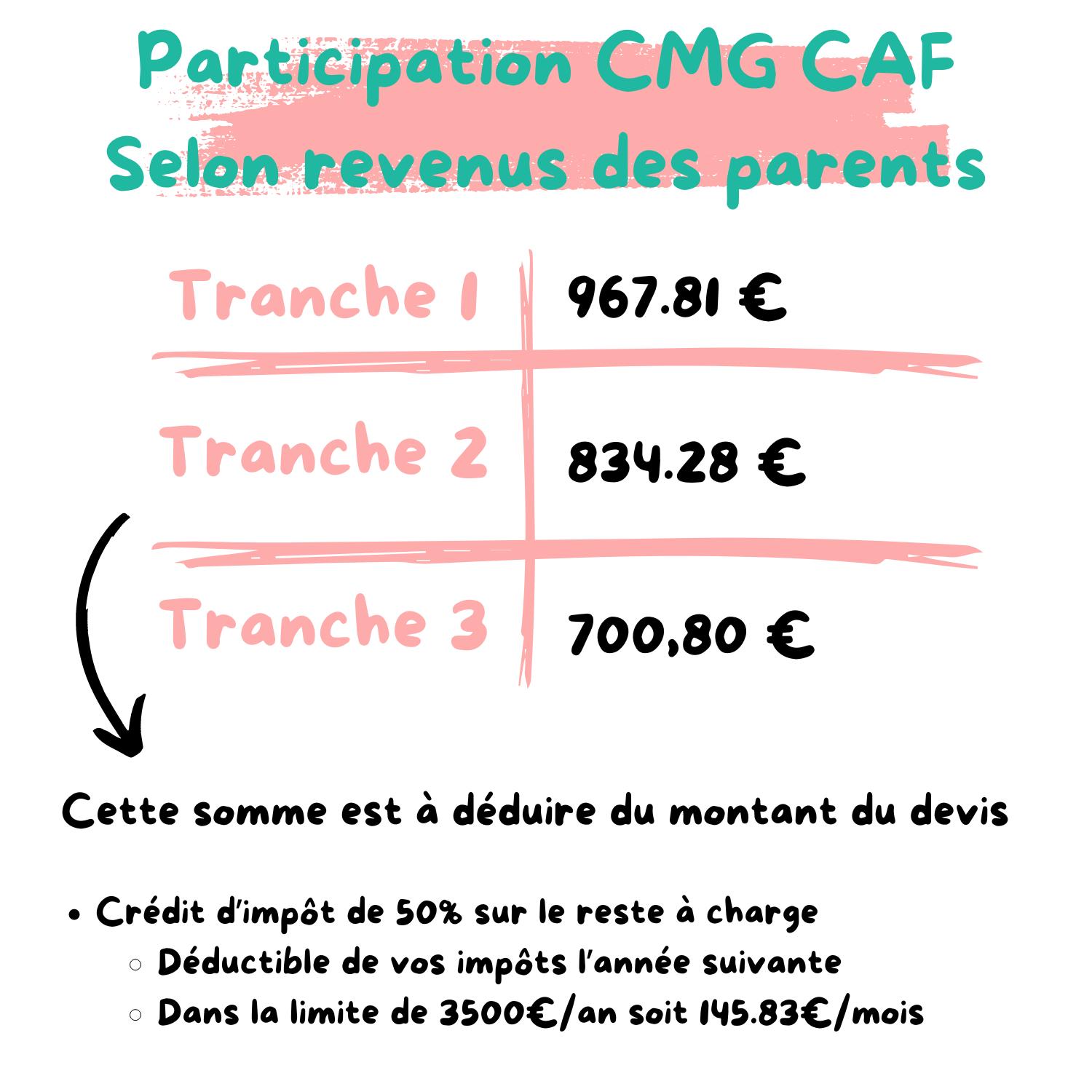 Notre micro-crèche privée fonctionne sous le régime de la PAJE (Prestation d’accueil du jeune enfant). Les familles paient la prestation de garde auprès de la crèche et sont directement remboursées d’une partie par la CAF, grâce à l’aide CMG (complément du mode de garde), selon leur tranche de revenus. Elles bénéficient également de crédit d’impôt l’année suivante.